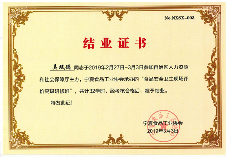 行政部經理賈麗茹參加“食品安全衛生現場評價高級研修班“順利結業